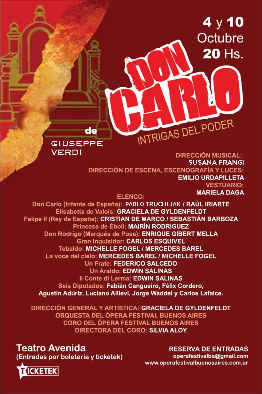 Don Carlo es una de las óperas más grandiosas y conmovedoras de Giuseppe Verdi, basada en la obra teatral de Friedrich Schiller. Estrenada en 1867 en París en su versión original en francés (Don Carlos), y posteriormente adaptada al italiano, la ópera explora el conflicto entre el deber, el amor y la libertad en el marco de la España del siglo XVI.